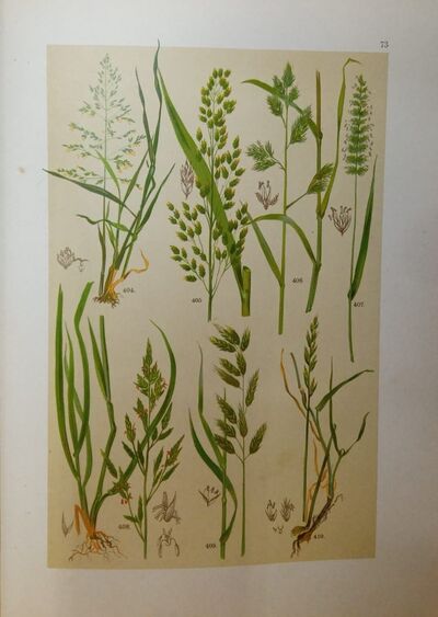 litografie (1899) - Lipnice obecná, Zblochan vodní, Srha laločnatá, Poháňka hřebenatá, Kostřava luční, Sveřep měkký, Jílek ozimý (byliny - botanika - herbář)