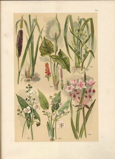 litografie (1899) - Orobinec širolistý, Zevar větevnatý, Aron skvrnitý, Žabník jitrocelový, Šípatka vodní, Šmel okoličnatý (byliny - botanika - herbář)