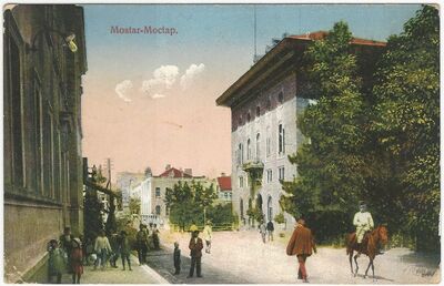 Mostar - Bosna a Hercegovina (bar. fotopohled) - rušná ulice, jezdec na koni