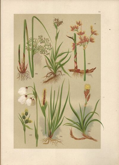 litografie (1899) - Sítina rozkladitá, Bika ladní, Skřípina jezerní, Suchopýr úzkolistý, Ostřice trsnatá, Ostřice jará (byliny - botanika - herbář)