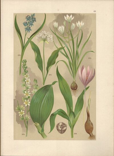 litografie (1899) - Snědek okoličnatý, Ladoňka dvoulistá, Česnek medvědí, Kýchavice bílá, Ocún jesenní (byliny - botanika - herbář)