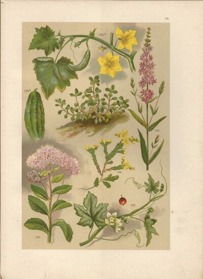 litografie (1899) - Kyprej obecný, Kuřinec kalužní, Posed dvoudomý, Okurka, Rozchodník velký, Rozchodník ostrý (byliny - botanika - herbář)