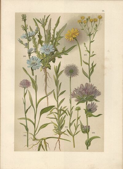 litografie (1899) - Jestřábník okoličnatý, Čekanka obecná, Pavinec obecný, Řepka hlavatá, Zvonek klubkatý (byliny - botanika - herbář)