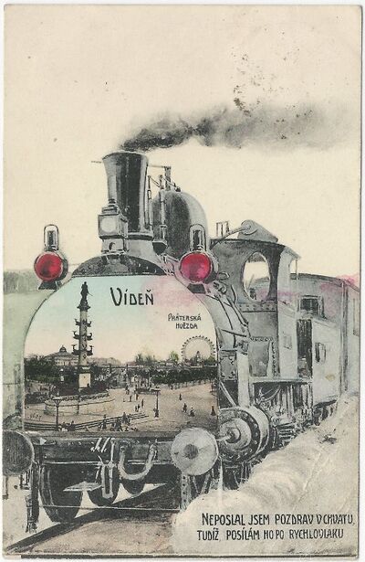 Koláž - vlak - Vídeň - Pozdrav v chvatu - lokomotiva, Prátr