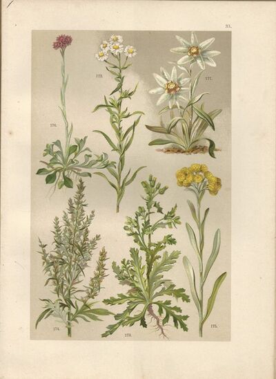 litografie (1899) - Bertrám, Černobýl, Protěž písečná, Protěž dvoudomá, Protěž alpská, Starček obecný (byliny - botanika - herbář)