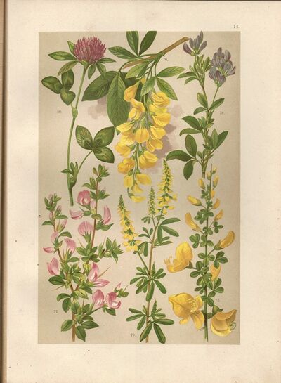 litografie (1899) - Janovec, Čilimník odvislý, Jehlice smrdutá, Vojtěška setá, Komonice lékařská, Jetel luční (byliny - botanika - herbář)