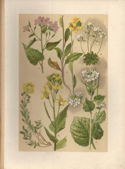 litografie (1899) - Kapusta zelná, Hořčice rolní, Měsíčnice lesní, Tařice chlumní, Chudobinka jarní, Česnáček obecný (byliny - botanika - herbář)