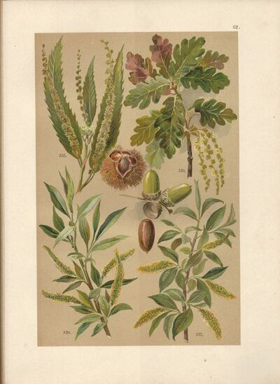 litografie (1899) - Kaštan vlašský, Dub letní, Vrba pětimužná, Vrba křehká (stromy - dendrologie)