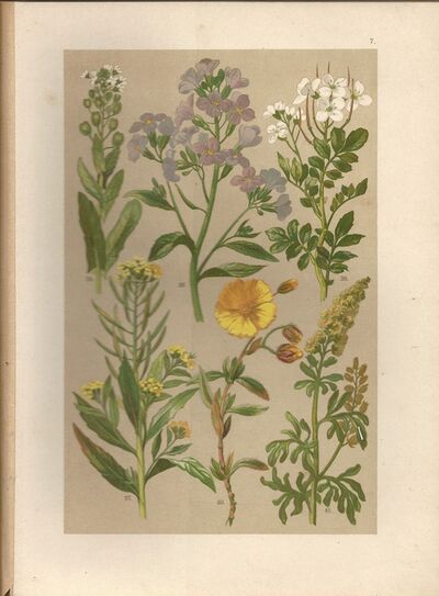 litografie (1899) - Večernice vonná, Trýzel malokvětý, Řeřišnice hořká, Penízek polní, Devaterník, Rýt žlutý (byliny - botanika - herbář)