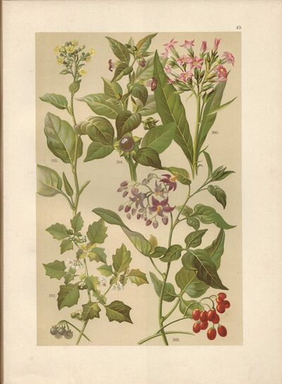 litografie (1899) - 1 Tabák obecný, Tabák selský, Potměchuť, Lilek černý, Rulík zlomocný (byliny - botanika - herbář)