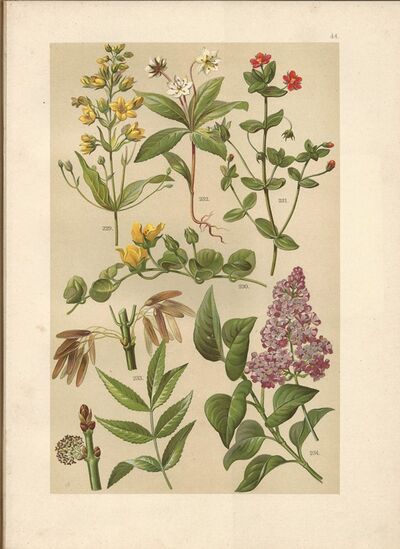 litografie (1899) - Vrbina obecná, Vrbina penízková, Drchnička rolní, Sedmikvítek obecný, Jasan ztepilý, Šeřík obecný (byliny - botanika - herbář, dendrologie)