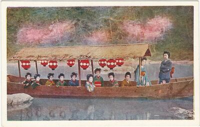 Gejši v loďce - Japonsko (bar. tisk)