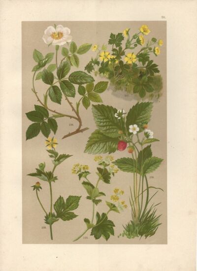 litografie (1899) - Růže plazivá, Mochna jarní, Jahodník obecný, Kuklík lékařský, Kontryhel obecný (byliny - botanika - herbář)