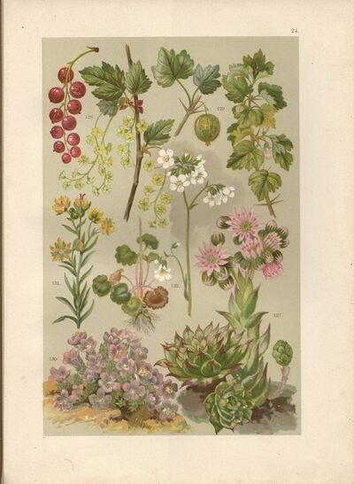 litografie (1899) - Netřesk obecný, Rybíz, Angrešt, Lomikámen vstřícnolistý, Lomikámen žlutý, Lomikámen zrnatý (byliny - botanika - herbář)