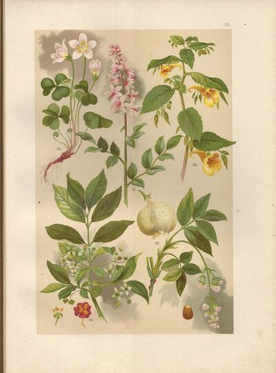 litografie (1899) - Netýkavka, Šťavel kyselý, Třemdava bílá, Brslen, Klokoč (byliny - botanika - herbář)