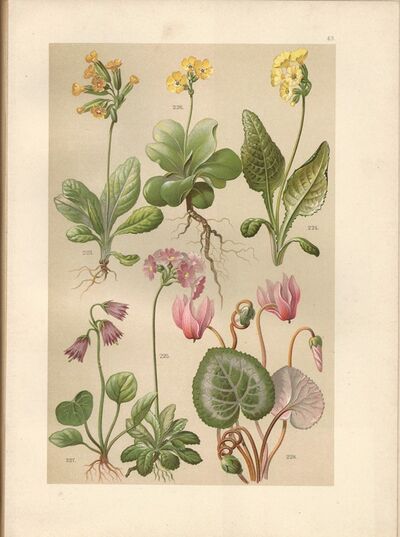 litografie (1899) - Prvosenka jarní, Prvosenka bledožlutá, Petrklíč pomoučený, Aurikule, Dřípatka alpská, Brambořík evropský (byliny - botanika - herbář)