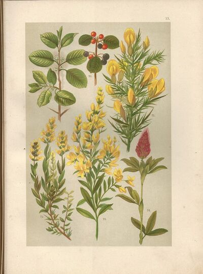 litografie (1899) - Krušina, Hlodáš evropský, Kručinka německá, Kručinka barvířská, Jetel válcovitý (byliny - botanika - herbář)