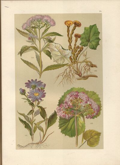 litografie (1899) - Sadec konopáč, Havez bělolistá, Podběl obecný, Hvězdnice chlumní (byliny - botanika - herbář)