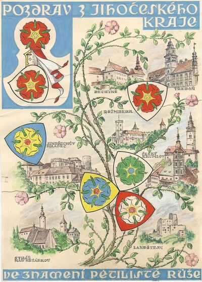 Karel Liška (1910-1993) - orig. kresba, tuš, tempera - Pozdrav z Jihočeského kraje - heraldika, hrady