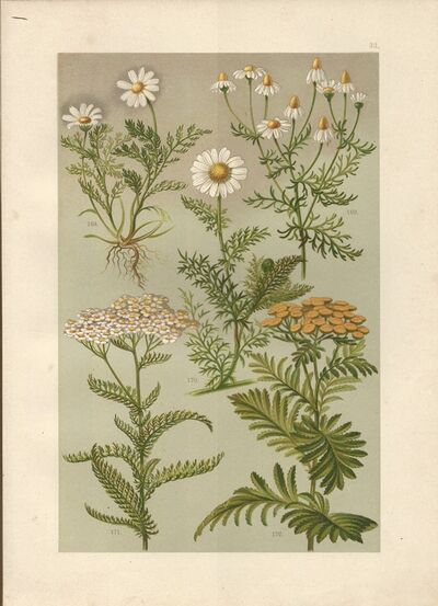 litografie (1899) - Heřmánek nevonný, Heřmánek pravý, Rmen římský, Řebříček obecný, Vratič (byliny - botanika - herbář)