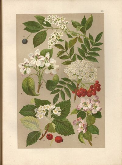litografie (1899) - Střemcha obecná, Hrušeň, Jabloň, Jeřáb, Muk (ovoce - pomologie)