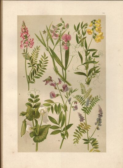 litografie (1899) - Vičenec, Vikev ptačí, Hrách setý, Hrachor lesní, Hrachor luční, Lecha jarní (byliny - botanika - herbář)