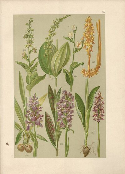 litografie (1899) - Kruštík širolistý, Okrotice bělavá, Bradáček vejčitý, Hlístník hnízdák, Vstavač obecný, Vstavač přilbonosný, Vstavač plamatý (stromy - dendrologie)