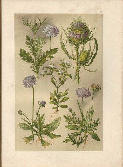 litografie (1899) - Kozlíček, Štětka obecná, Čertkus luční, Hlaváč obecný, Chrastavec polní (byliny - botanika - herbář)