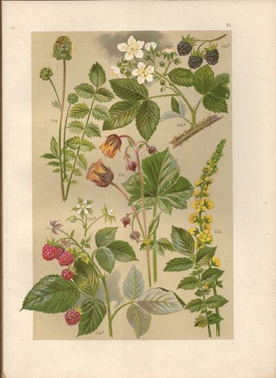 litografie (1899) - Kuklík potoční, Maliník, Ostružiník, Krvavec obecný, Řepíček (byliny - botanika - herbář)