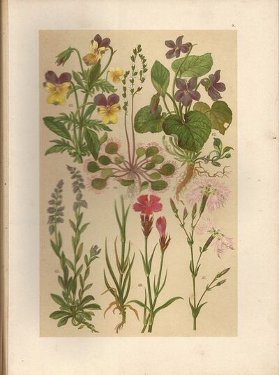 litografie (1899) - Violka vonná, Maceška, Rosnička okrouhlolistá, Vítod pospolitý, Hvozdík kartouzek, Hvozdík pyšný (byliny - botanika - herbář)