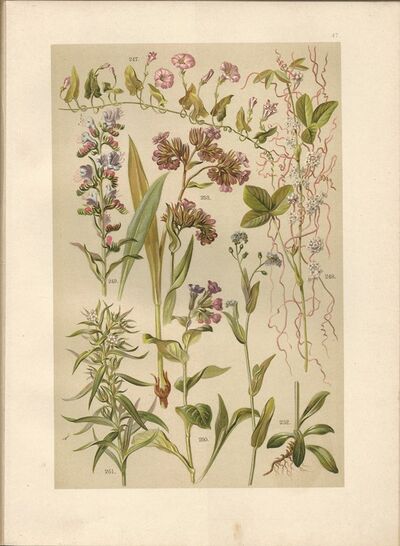 litografie (1899) - Svlačec rolní, Kokotice menší, Hadinec obecný, Plicník lékařský, Kamejka lékařská, Pomněnka prostřední, Pilát lékařský (byliny - botanika - herbář)
