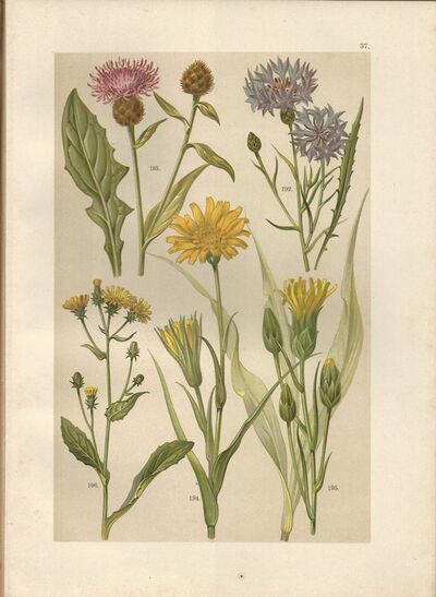 litografie (1899) - Chrpa modrák, Chrpa černá, Kozí brada luční, Hadí mord španělský, Hořčík jestřábníkový (byliny - botanika - herbář)