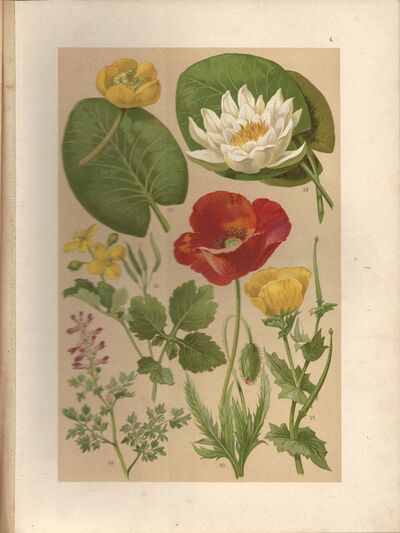 litografie (1899) - Leknín, Stulík žlutý, Mák vlčí, Rohatec žlutý, Vlaštovičník, Zemědým (byliny - botanika - herbář)